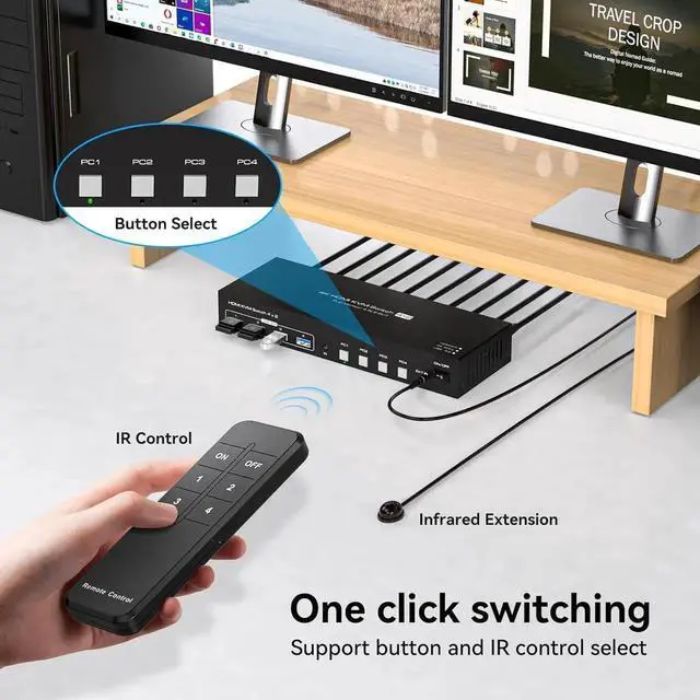 Two switching modesThe kvm switch dual monitor allows for one-touch switching via panel buttons or an included external infrared remote control. LED lights indicate the active computer, providing added convenience.