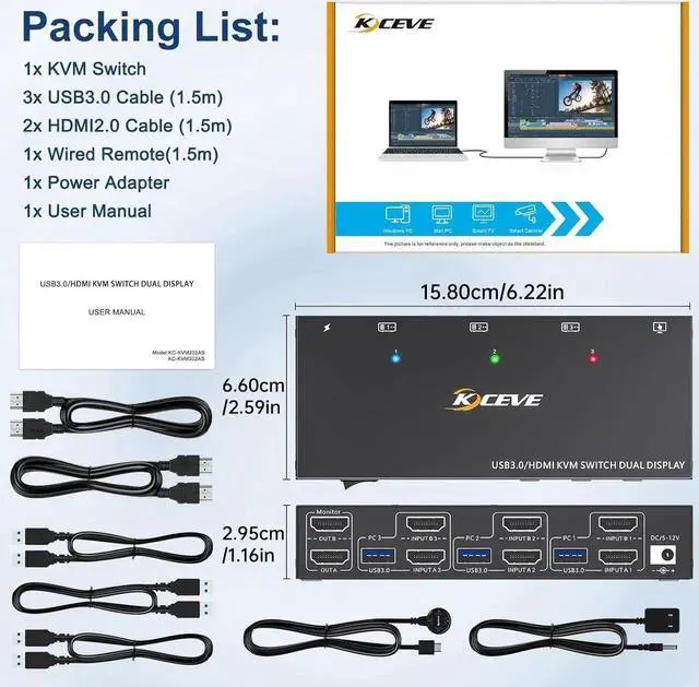 KVM Switch Dual Monitor 3 computersThis 2 monitor KVM switch allow you to control 3 computers or laptops by only one set of wired or wireless keyboard mouse, share 4 USB 3.0 devices and 2 monitors (Extend display mode or copy display mode).