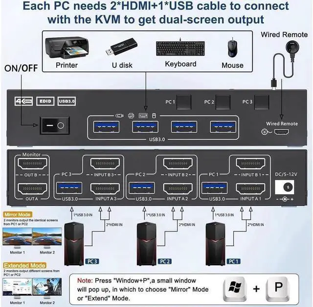 [KVM Switch dual Monitor 3 PCs] This KVM switch allow you to control 3 computers or laptops by only one set of wired or wireless keyboard mouse, share 4 USB 3.0 devices and 2 monitors (Extend display mode or copy display mode). Please note that the extended mode can output two different screens, and the copy mode can output two identical screens.