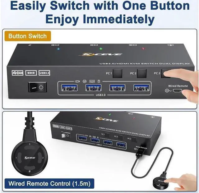 • [Great Compatibility & 2 Switching Mode] driver-free for Windows and Mac OS.plug and play,no external power required. you can press the button on the panel or use the wired remote to switch the computers.LED indicate the active computer..