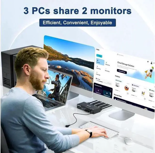 • [KVM Switch dual Monitor 3 PCs] This KVM switch allow you to control 3 computers or laptops by only one set of wired or wireless keyboard mouse,share 4 USB 3.0 devices and 2 monitors(Extend display mode or copy display mode). Please note that the extended mode can output two different screens, and the copy mode can output two identical screens.