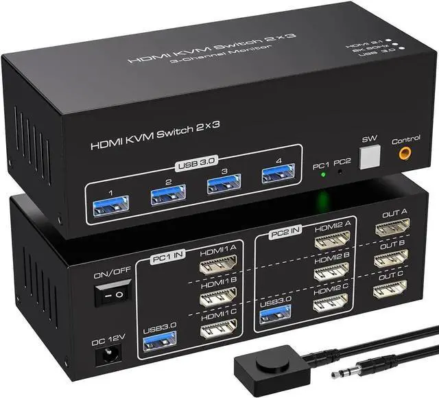 KVM Switch 3 Monitors 2 ComputersKVM Switch 3 Monitors allow two computers to share triple high-definition monitors and 4 USB 3.0 ports, such as mouse, keyboard, printer U disk, etc. And connect three displays in extend or duplicate display mode.