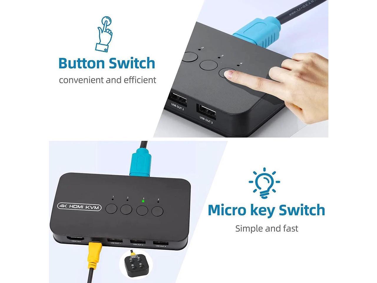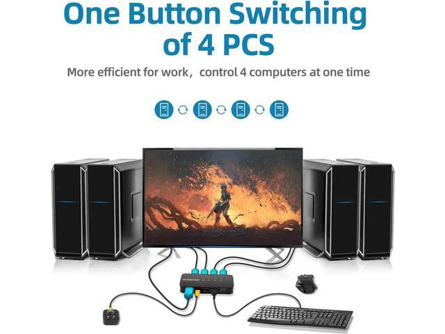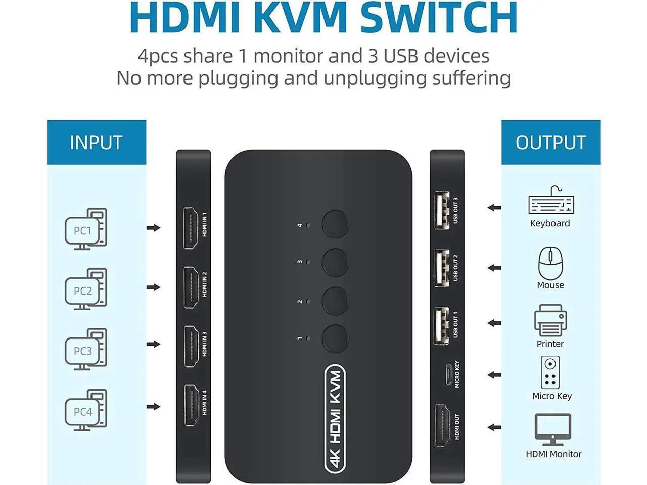 - Ideal Sharing Switches: The HDMI USB KVM Switch can share one HD 4K monitor and 3 USB 2.0 devices such as scanner mouse keyboard between 4 computers.