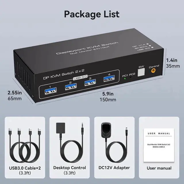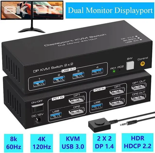 8K@60Hz Displayport KVM Switch 2 Monitors 2 Computers, USB 3.0 DP KVM switches for 2 computers share Dual monitors and 4 USB devices Support 4K@120Hz DP 1.4 with External Kit and 12V DC adapter