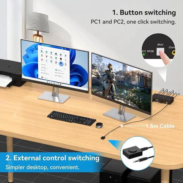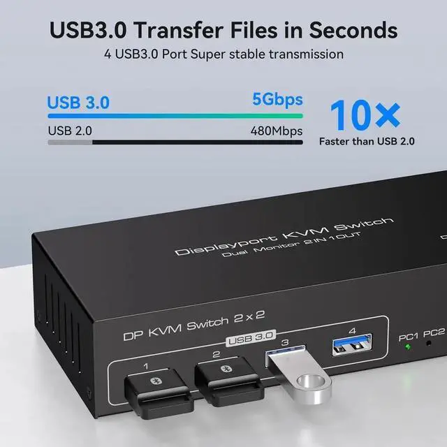 KVM Switch 2 Monitors 2 Computers: This DP KVM switch allow 2 computers or other signal source to share 2 HD monitors and 4 USB 3.0 ports, such as mouse, keyboard, printer U disk or gamepad, etc. Has copy and extend modes to enhance your experience.