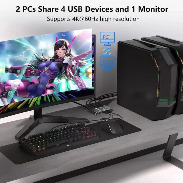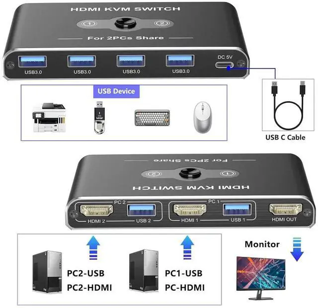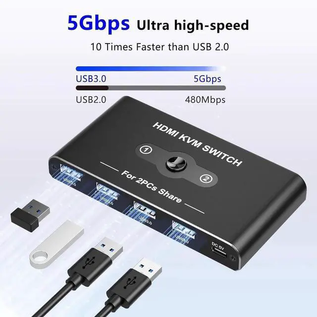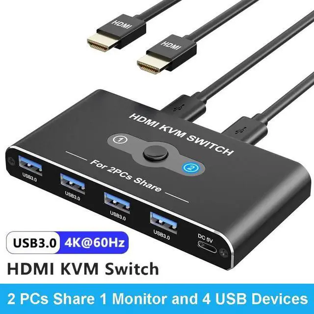 USB HDMI KVM Switch is A great accessory for a family, office or other workplaces. You can share a single USB keyboard, USB mouse and HDMI monitor with both systems, saving space on your desk and using your preferred display, keyboard and mouse with both computers.