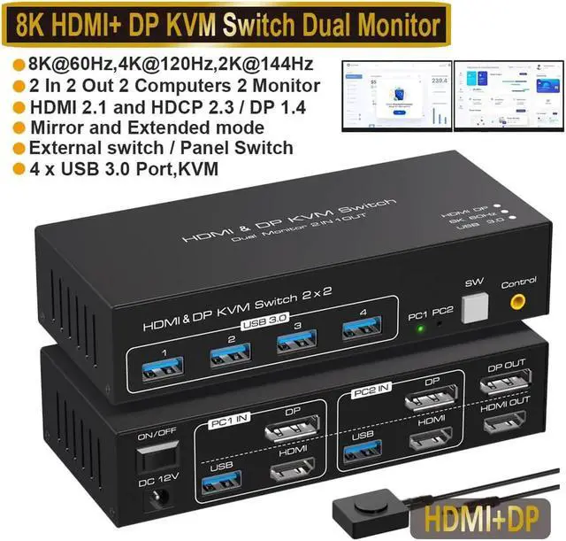 Dual Monitor HDMI+DP KVM Switch for 2 computers share 2 monitor and 4 USB 3.0 device