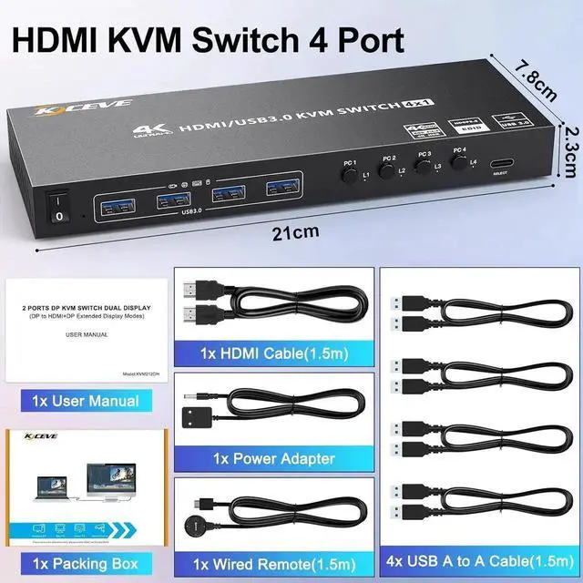 USB 3.0 HDMI KVM switch with 4 USB 3.0 ports (for connecting USB devices) Supports ultra-fast USB 3.0 data transfer, Data transfer speeds up to 5Gbps, and is backward compatible with USB 2.0.