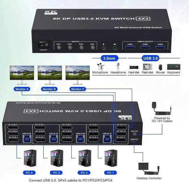 1. 8K KVM Switch allows 4 computers/laptops share one set of keyboard, mouse, and 3 monitors