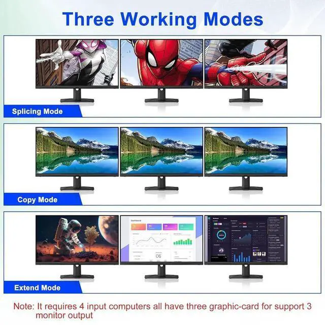 2. This 3 monitor KVM switch 4 ports does not mean that it can only be connected to 4 computers. You may only have 2 computers now, but you may need to use 3 or 4 computers in the future, then you can choose this switch. Please make sure each of your PC has the ability to support triple display before purchasing.