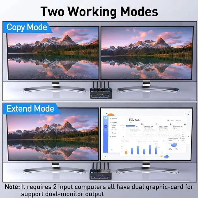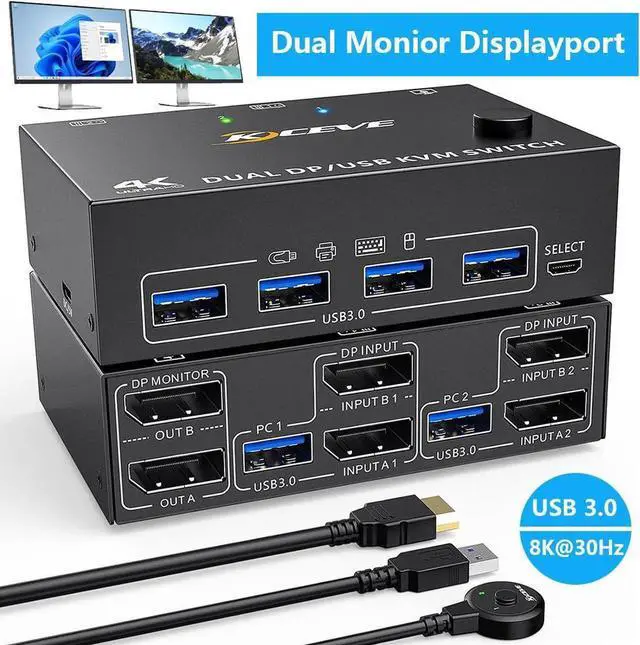 2 Ports Dual Monitor DP KVM Switch for 2 computers share 2 monitors and 4 USB3.0 devices.