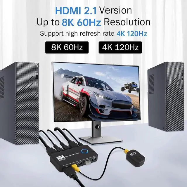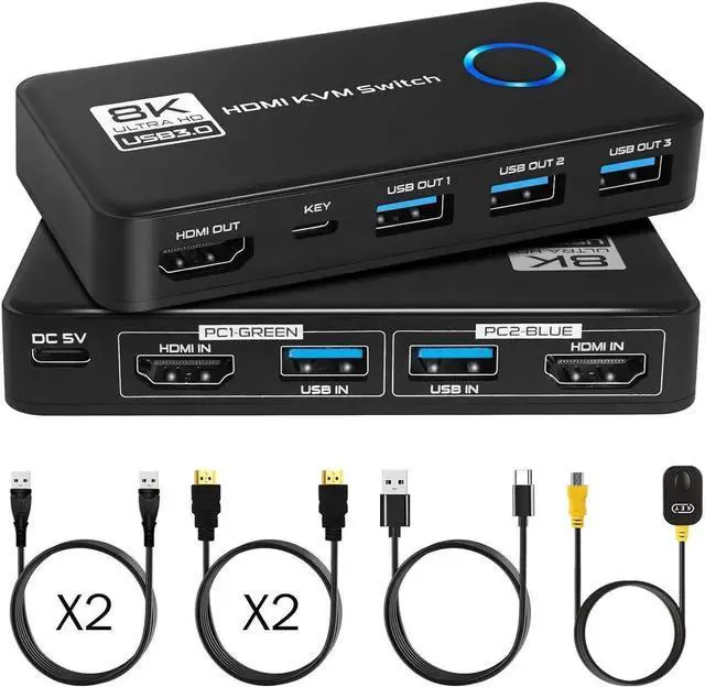 2 Port HDMI KVM Switch, 8K@60Hz 4K@120Hz HDMI USB 3.0 KVM Switch for 2 Computer Share 1 HD Monitor and 3 USB 3.0 Devices, Included Wired Remote, 2 HD-MI 2.1 Cables and 2 USB 3.0 Cables