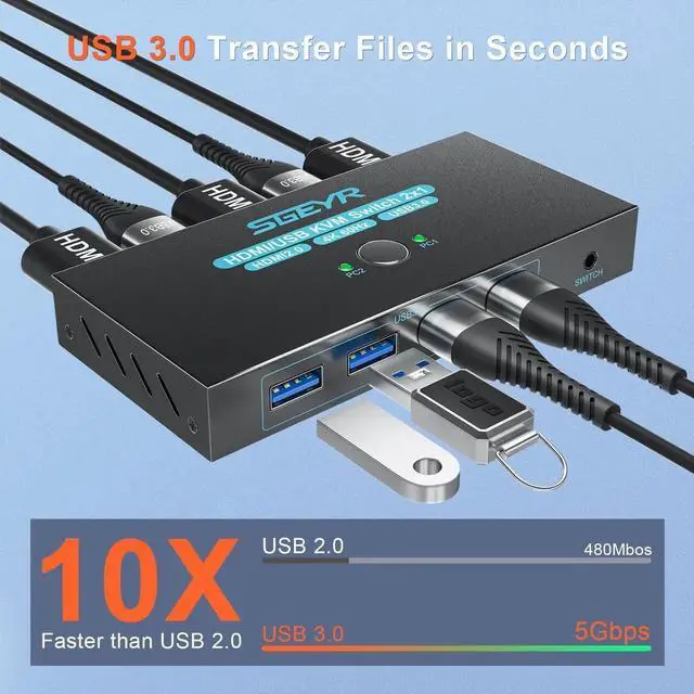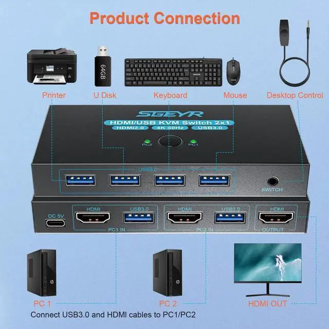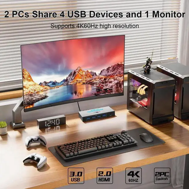 1: This USB kvm Switch Comes with 2-IN-5-Out---4 USB 3.0 Ports+4K@60Hz HDMI Port , Share 5 Peripheral devices between two systems.