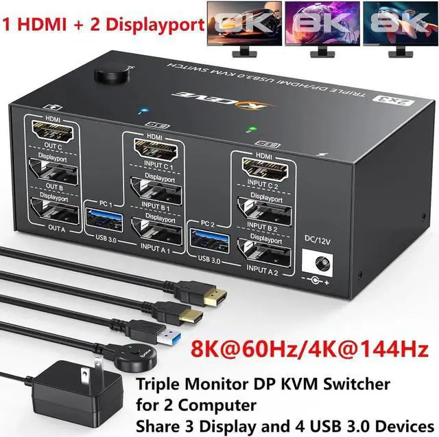 - This 2 Displayport+HDMI triple monitor KVM switch is perfect for 2 computers or laptops to share 3 monitors and 4 USB 3.0 devices (keyboard, mouse, printer, scanner and other USB devices, making the work space tidier and greatly improve work efficiency.