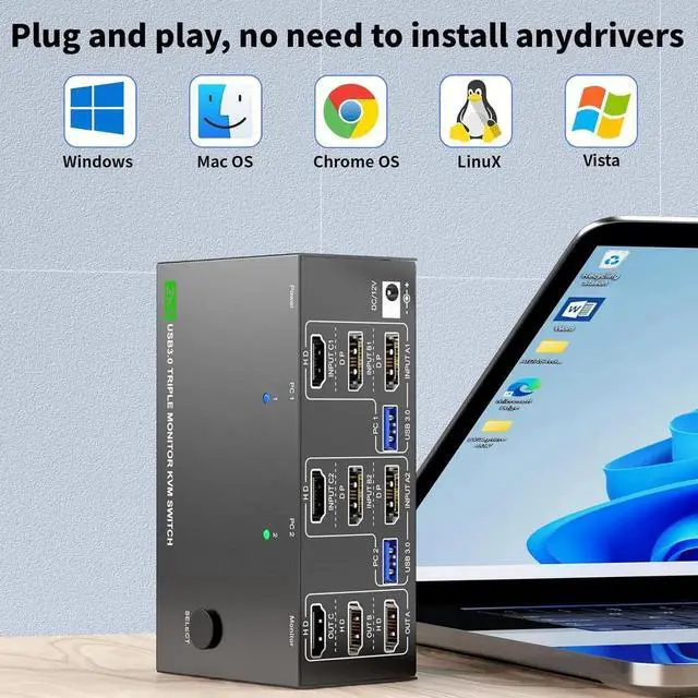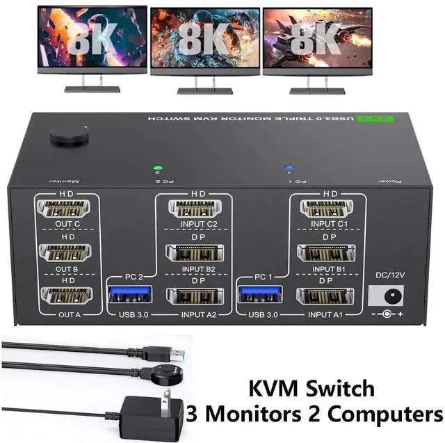2 computers 3 Monitors KVM Switch -- one set of wired/wireless keyboard mouse controls two computers, sharing three monitors, suitable for users with 2 computers and 3 monitors, supporting Mirror mode and extended Mode, helping you balance work and play.