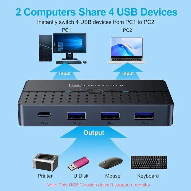 - 2 input 4 output: this USB 3.0 switch allows 2 Computers to Share 4 USB devices.