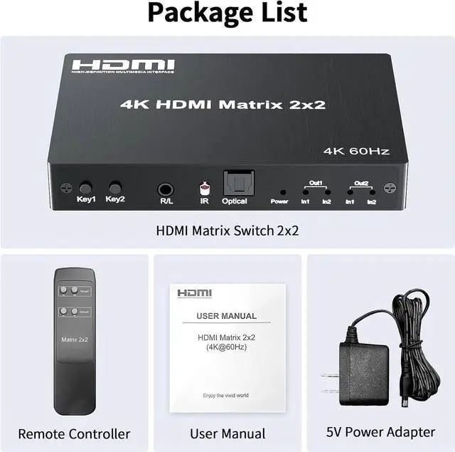 The 2 in 2 Out HDMI Matrix Switch can connect two HDMI input signals to be switched or split easily to two HDMI compatible monitors or projectors. Supports Optical fiber and stereo audio output at the same time via HDMI output 1 port. It is suitable for home theater, school presentation, conference room, shopping mall, video wall, data center ccontrol, and corporate training environments etc