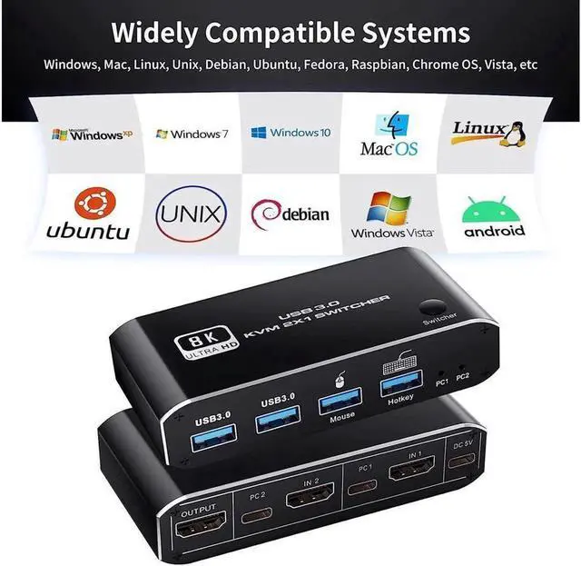 Wide Compatibility The 4K@120Hz HDMI 2.1 KVM Switch can work as a normal 2-port HDMI 2.1 switch and is compatible with Xbox Series X/S, PS5, PS4 Pro, Apple TV, etc.