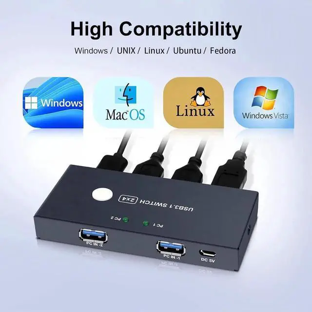 This USB KVM switch is compatible with USB 3.1 gen1 standard and most systems, including Windows 10/8/7/Vista/XP, Mac OS X, Linux, Chrome OS and other systems. The automatic adjustment function can adapt to a variety of complex application environments. ESD protection circuit against static charge to protect system safety all around. Plug and play, very convenient.