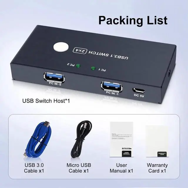 The package includes: USB switch host*1, USB cable *2, micro USB cable *1, user manual *1.