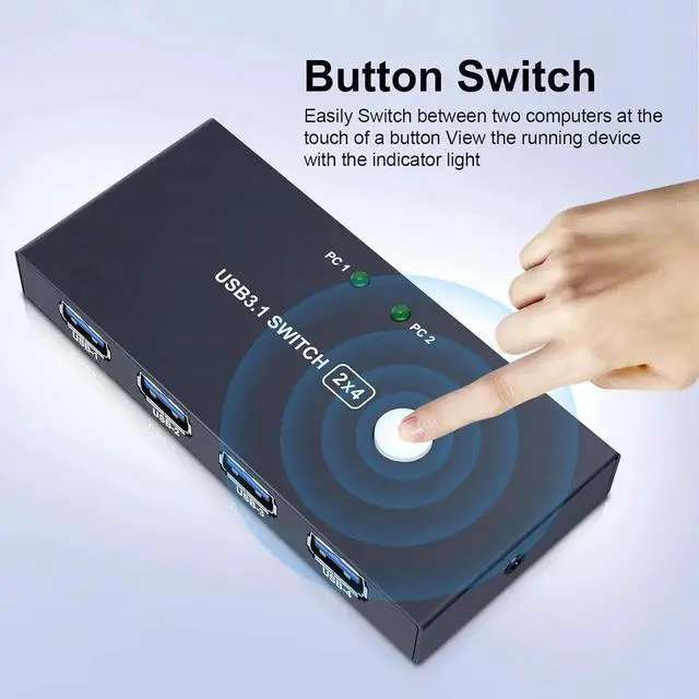 With this USB switch you can easily switch between the 2 PC by simply press on the button of the control panel. PC1 display is on and PC2 is off, that means input device 1; PC2 display is switched on and PC1 display is switched off, which means that the input device 2 is used. The green LED on the USB sharing switch shows which PC is accessed to.