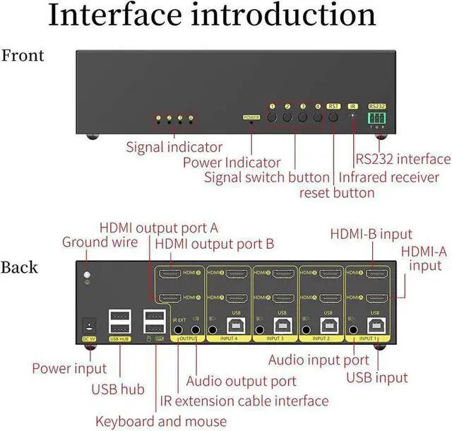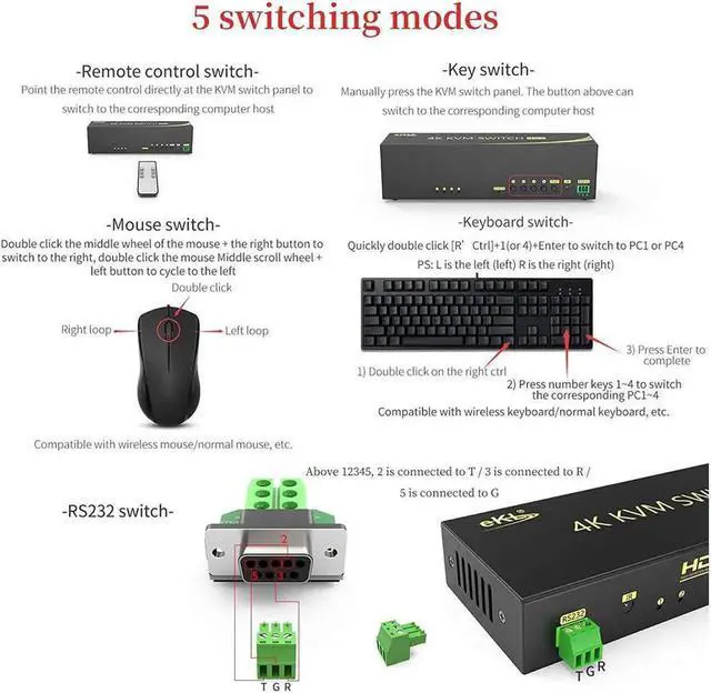 Description: 4 Port Dual Monitor HDMI KVM Switch Extended Display, 4 computers or Laptops sharing with one set of keyboard, mouse and 2 monitors which supports dual monitor extended display or duplication; Each computer and laptop need to have 2 video output interfaces and support extended display. Support Dual HDMI or HDMI + VGA / DVI / DisplayPort Computers & Laptops (Need Adapters, Not Included), Please be aware of this before purchasing. (dual HDMI input is the best, not suggest to use convertor, if the convertor is not good quality, it may lead to not display or reduce the resolution) Convenient switch modes, 1. Hot key switching on keyboards that support all operation system; 2. Switch via Mouse Click switch; 3. Button swith on front panel; 4. Auto scan switch with adjustable interval (8-999 second). 5, RS232 code switch. Plug and play with no driver needed, include all cables and DC 5V/1A power adapter, with extra USB 2.0 ports for sharing USB printers, scanners and so on. Supports up to 4K @60Hz 4:4: 4, built-in Auto EDID, supports separate audio input and output. anti interference metal design to ensure sturdiness.