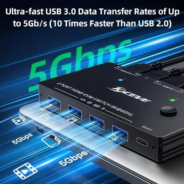 HDMI KVM Switch with 4 USB 3.0 PortsUSB 3.0 KVM Switches come with 4 USB 3.0 ports for sharing USB devices, such as keybaord, mouse, scanners, printers, U disks and more other USB devices, supports ultra-fast USB 3.0 data transfer up to 5Gbps, 10 times faster than USB 2.0, backward compatible with USB 2.0 / 1.1 devices.
