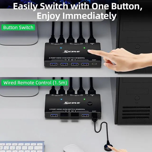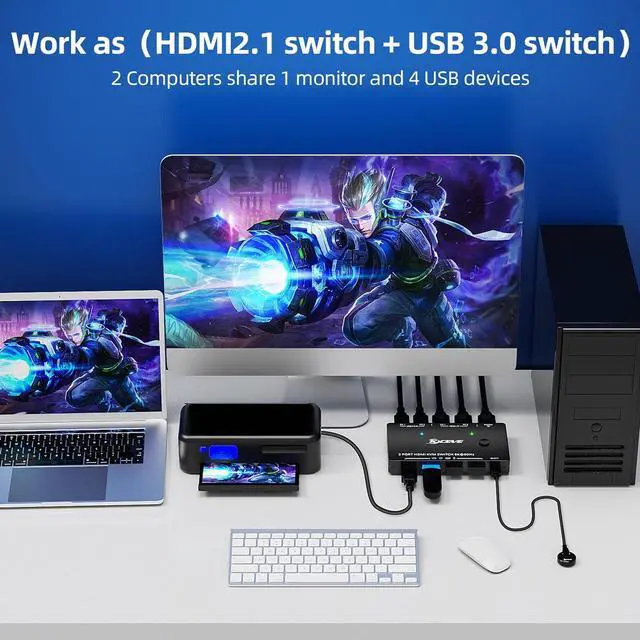 USB 3.0 KVM Switch HDMI 2.1 2 port 8K HDMI 2.1 KVM Switch can control 2 computers to share 1 monitor with 1 set of wired or wireless keyboard and mouse. You can quickly switch between two computers (2-5 seconds).