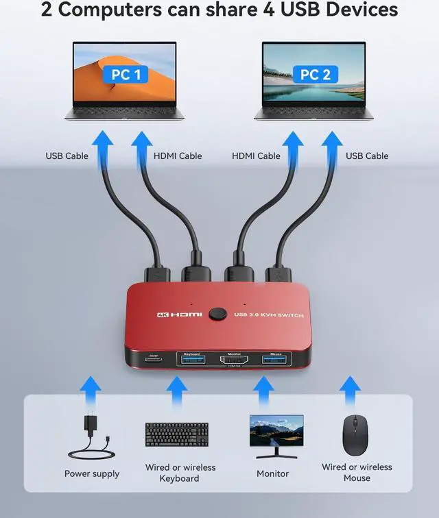 Free UP Your Desk SpaceABLEWE kvm switch save your desk space when you need to use two computers, you can easily switch between 2 computers and usb devices without all the clutter. No need to plug and unplug hdmi cable and usb cable back and forth anymore, making your work much more convenient and efficient.