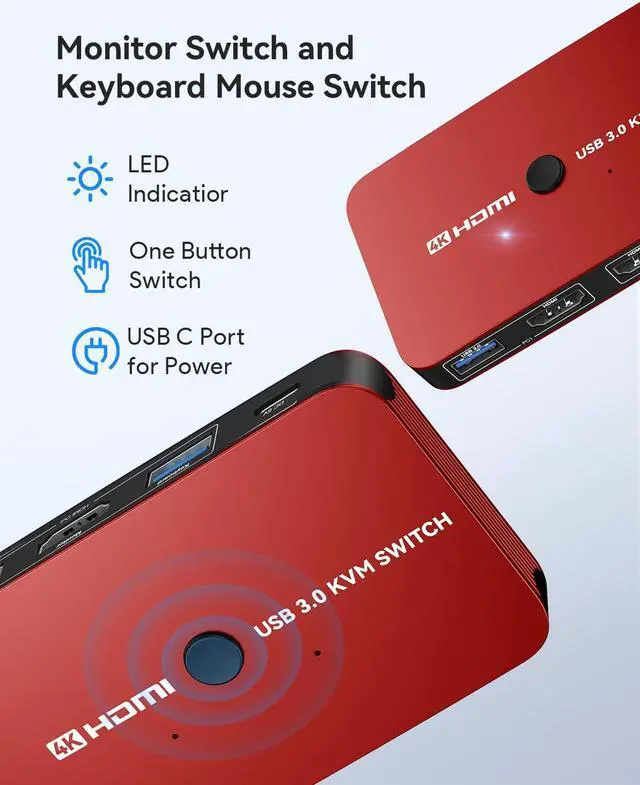 USB KVM HDMI Switch BoxThis HDMI KVM Switch allows you to control 2 computers with only one set of USB devices (Monitor, Mouse, Keyboard and Printer). You can easily switch between two displays with one button-pressing, it is not only a monitor switch but also a keyboard mouse switch.