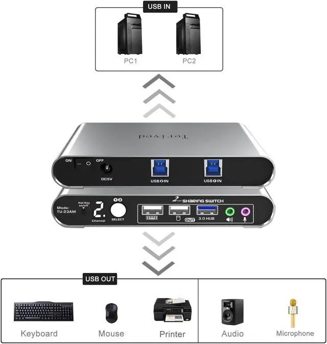 USB Switch - Share 3 USB devices, such as a keyboard, mouse, scanner, printer, speaker, headphone, or other USB devices, between two computers, along with audio and microphone jacks. Once the hotkeys are turned off, the dedicated mouse and keyboard USB ports can be used for other USB devices.