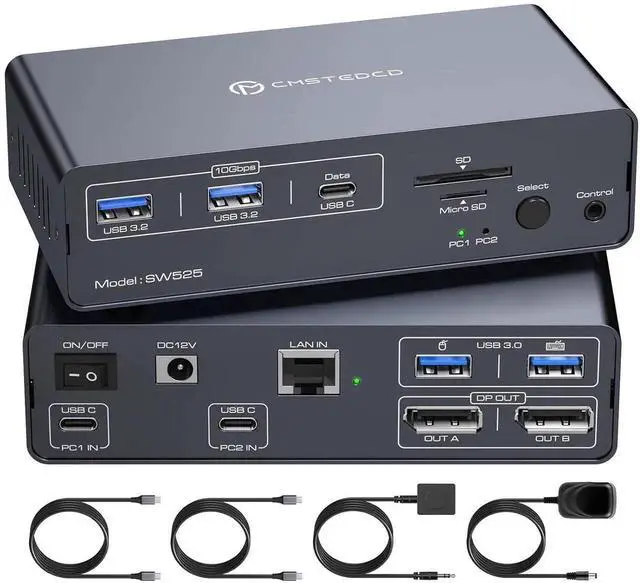The KVM switch dual monitor displayport has 2 USB 3.2 ports and one USB C port. The transmission speed is up to 10Gbps, suitable for devices such as USB flash drives and hubs. The USB 3.0 port is for mouse and keyboard, making the connection smoother and downward compatible with USB 2.0. Equipped with SD and Micro SD card ports to copy data to laptops and PCs easily.
