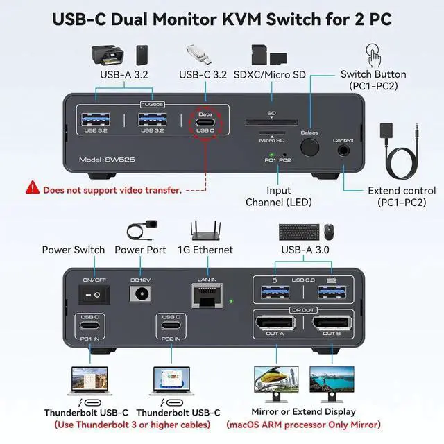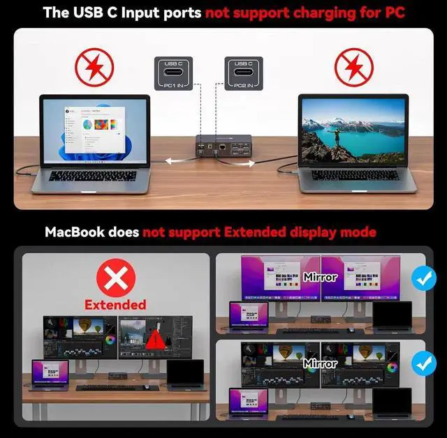 Read before purchasing: 1. The USB C input of this kvm Switch cannot reverse charge a laptop (not PD capable) 2. Due to technical limitations Macbook or Mac OS users do not support the extend function, extend to two different images is not supported. Only copy mode is supported. 3. Please make sure the USB C port of your laptop is Thunderbolt 3 or above. Otherwise this device will not work.