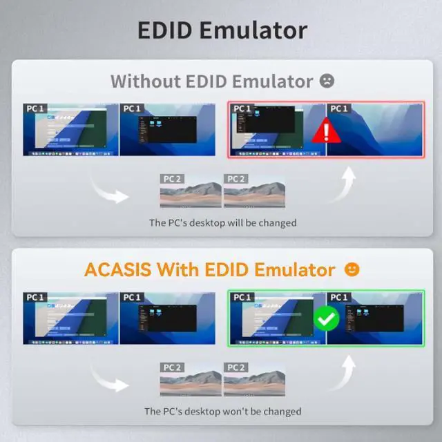 4K@60Hz & EDIN EmulatorsACASIS HDMI KVM switch supports 4K@60Hz resolution and includes EDID emulators on each input port to ensure consistent display information, preventing window changes upon input switching.