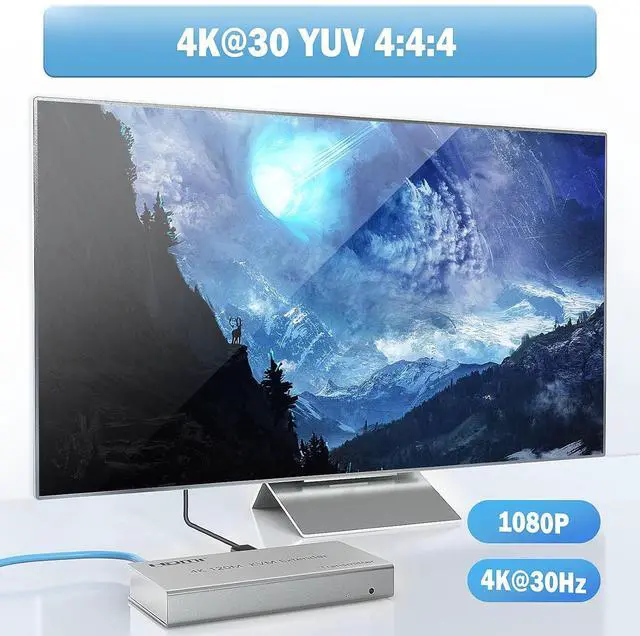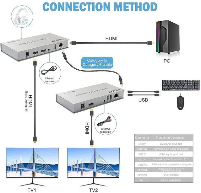 HDMI KVM USB Extender, CAT6, 4K@30Hz, Long Distance Transmission with 2 USB 2.0 Ports for Remote Keyboard & Mouse ControlEnhance your workspace and video setups with the HDMI KVM USB Extender, engineered to transmit high-quality 4K video signals at 30Hz over CAT6 cables. Ideal for situations requiring long-distance transmission, this extender facilitates the control of remote devices via USB 2.0 ports, supporting keyboards and mice. It's perfect for professionals who need to operate servers, computers, or other HDMI devices from afar, ensuring clear image quality and reliable device interaction.