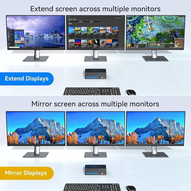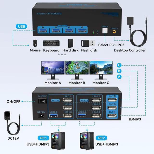 KVM Switch 3 Monitors 2 ComputersThis KVM Switches allow two computers to share 3 HDMI monitors and 4 USB 3.0 ports, such as mouse, keyboard, printer, etc. And connect three displays in extend or duplicate display SW230-Deep Bluek "Windows+P" to select "Duplicate" Mode or "Extend" Mode. Please note: Make sure your computer supports triple displays; when using KVM, each computer needs to be connected with 3 HDMI cables to KVM in order to output 3 video signals properly, if only 1 HDMI cable is connected, it can only transmit video to 1 monitor.