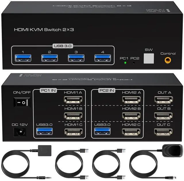 HDMI 2.1 KVM Switch 3 Monitors allows easy switching of a full set of keyboards and mice and other USB 3.0 devices between two computers and 3 monitors, Up to four USB devices can be shared at the same time, Avoiding frequent unplugging that can lead to device damage.