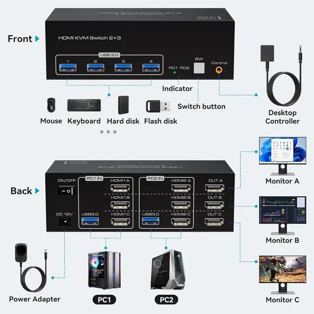 KVM Switch 2 Computers HDMI KVM Switch 3 Monitor 2 PC SPSWHD 8K@60Hz HDMI KVM Switch 3 Monitors 2 Computers share 3 Monitors and 4 USB 3.0 device Support Resolutions Up to 4K@120Hz/8K@60Hz, and backward compatible with lower resolutions: 4K@60Hz, 4K@30Hz, 1080P, 720P, etc. USB 3.0 with ultra-fast data transfer rates up to 5Gb/s, up to ten times faster than USB 2.0, and backward compatible with USB 2.0 and USB 1.1. Support for External Wired Controllers Supports Key Switching Support for Indicator Design
