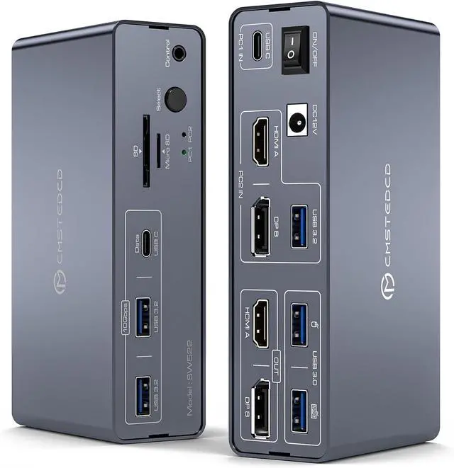 Supports controlling 2 computer devices and 2 monitors using only 1 set of keyboard and mouse.Supports mouse and keyboard connection to KVM via two USB 3.0 ports.Supports connecting barcode scanners,USB storage,or other high-speed USB devices through two USB 3.2 Gen2 and one USB-C portSupports HDMI version 2.0 and DP version 1.4, HDMI port supports resolutions up to 3840*2160(4K)60Hz, DP port supports resolutions up to 3840*2160(4K)120HzSupports host USB 3.2 Gen2 transfer rateSupport front panel buttons and external switch buttons to control KVM switch inputs.The USB-C port supports dual screen mode for Windows and Mac OS.Supports USB 3.0 SD card and Micro SD card