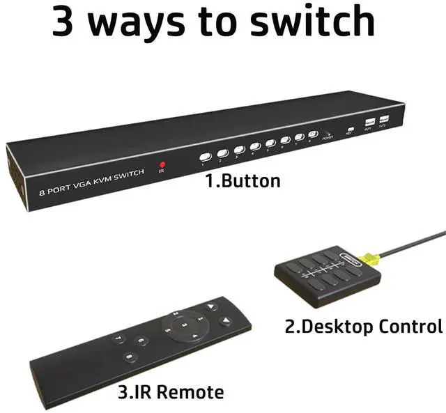 3 ways to switch - 8 port USB VGA KVM switch can be controlled by buttons ,remote or desktop controller, using the desktop controller will clean the office desktop, no messy cables on the desktop, clean and clear