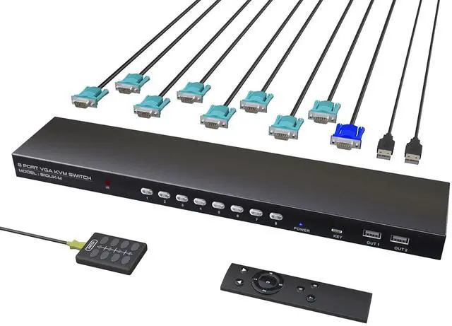 1080P Full HD - KVM switch VGA 8 port supports up to 1920*1440 resolution and ultra-wide screen display, supports high quality auto-recognition. KVM switch USB includes 8 KVM VGA cables, 1 remote 1 desktop controller.