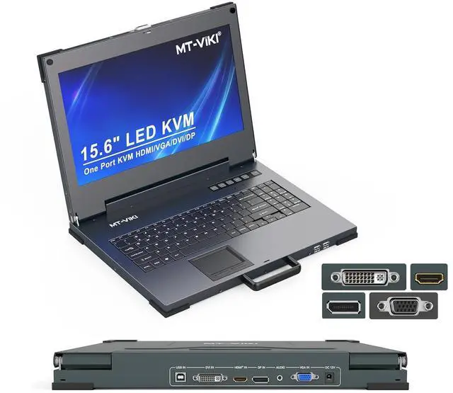 This Single port LCD KVM Console integrated with VGA/HDMI/Displayport/DVI Input Port (4 in 1 out), Keyboard, Mouse, Monitor, 3.5mm Audio and USB 2.0 Hub. Multi-interface, multi-system compatible.