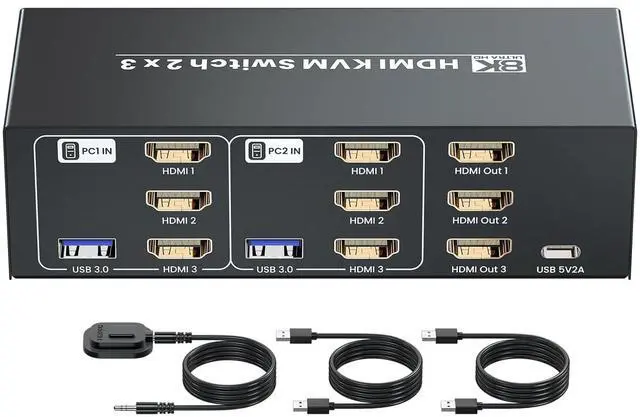 This 3 monitor HDMI KVM switch is designed to support 3 monitors and 2 computers, enables you to control 2 PC with a single set of peripherals(keyboard, mouse, printer and more), providing convenience for professionals, gamers, and users who require high-resolution, multi-monitor setups.