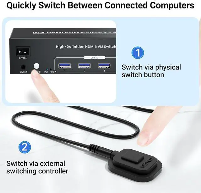 This 8K HDMI KVM switch 3 monitors 2 computers is equipped with two kinds of switching methods between 2 connected computers: with the push of a switching button on the HDMI KVM switch or via external controller kit, enjoy a smooth transition without interrupting your workflow.