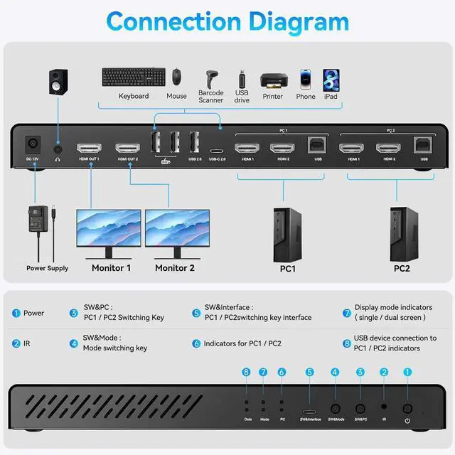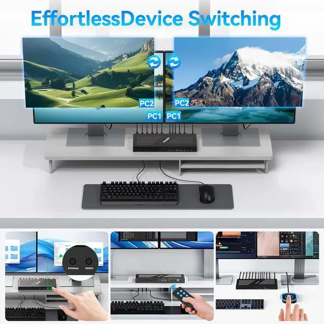 Versatile Display Options for Enhanced Productivity: Our kvm switch dual monitor caters to your diverse needs with two distinct display modes. USB Mode allows for the independent display of two PC screens, switchable at any moment without the need for reconnection. KVM Mode enables an extended or duplicated display across two monitors, making it ideal for detailed tasks or elevating your gaming experience.