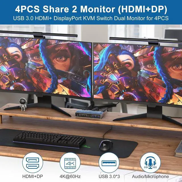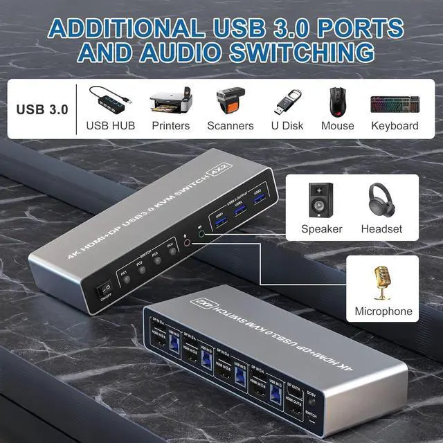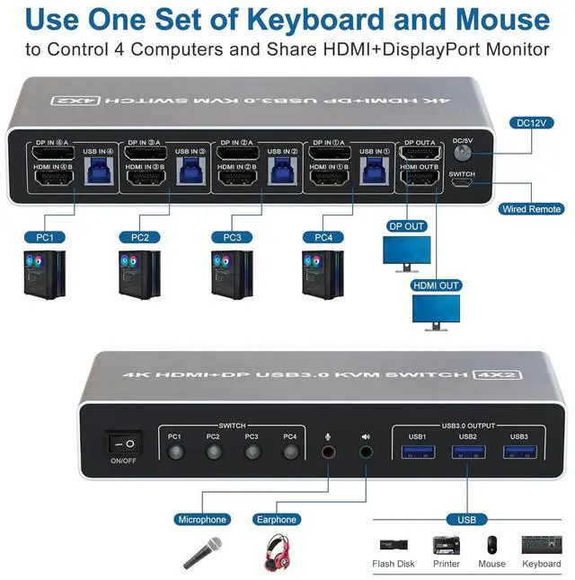 HDMI + DP Dual Monitor KVM Switch 4 computers share 2 monitor and 3 USB 3.0 devices, and Audio Microphone Ports 3 Port USB 3.0 with 5Gbps