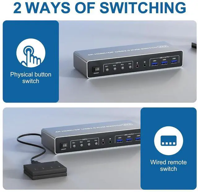 Support maximum resolution up to 4K 60Hz YUV 4:4:4, HDCP 1.4, HDR 2.2; Dual monitors output support up to 4K@60Hz for extended and mirrored displayDepends on your computer's graphics card;With 3 USB 3.0 Ports, USB 3.0 transmission rate up to 5Gbps;Supports Separate Audio and Microphone Output;2 switching methods, easy to switch. Support button switching and desktop wired remote controller;Compatible with multiple operating systems, such as Windows/Mac/Linux/Unix, etc;Easy installation, plug and play, no driver required.