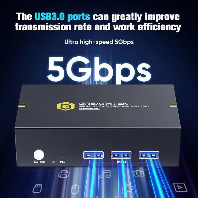 Dual monitor KVM Switch allows 2 computers to share multiple USB devices. It can greatly improve your work efficiency and meet your USB speed requirements.