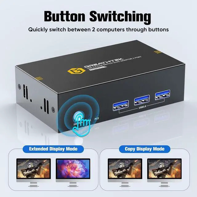 GREATHTEK USB3.0 KVM Switch Dual Monitor - 2 PCs Share 2 Monitor Hi-Speed USB 3.0 KVMSwitcher