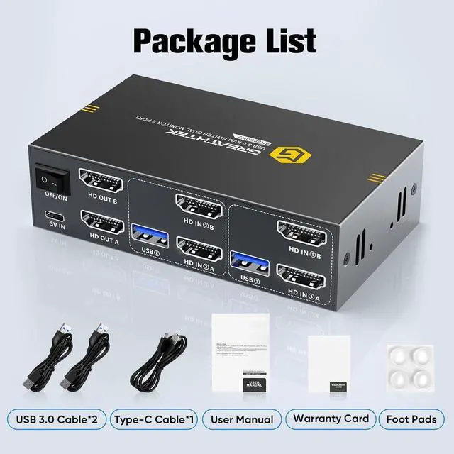 The product packaging is equipped with 1 USB3.0 KVM Switch Dual Monitor, 2 USB3.0 cables, 1 Type-C power cable.